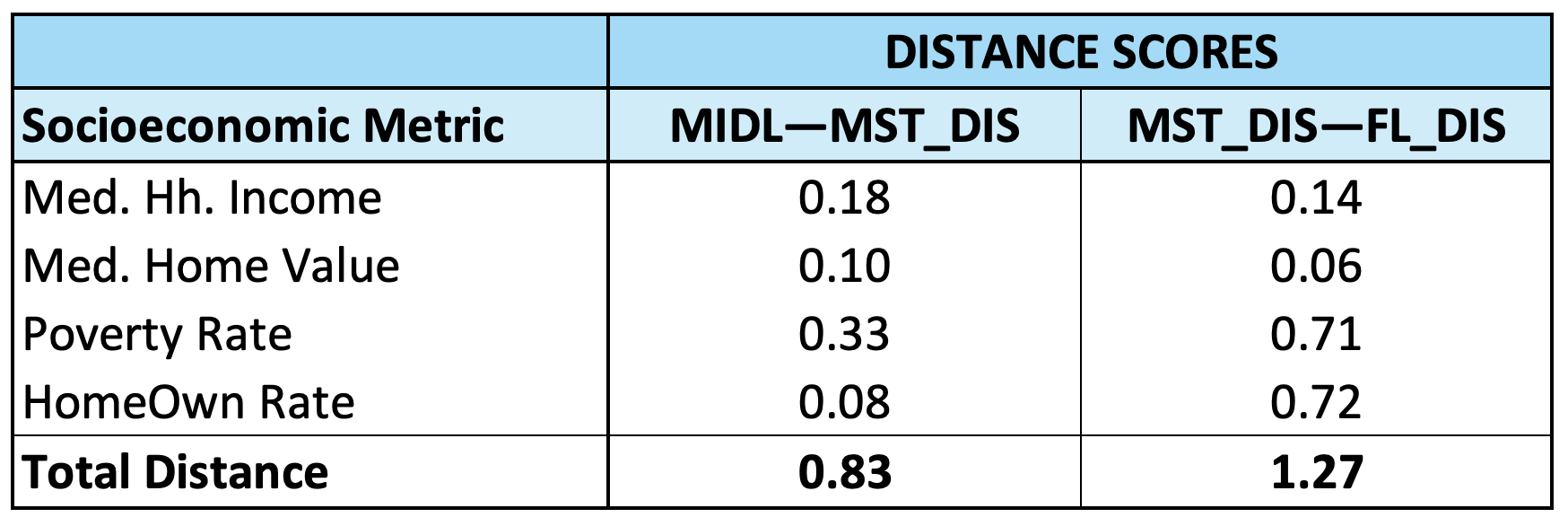 Going back to the distance calculations, it is interesting to note the longer and shorter distances when the MIDL—MST_DIS relationship is compared to the MST_DIS—FL_DIS relationship. The results show that the distance between the median household income and median home value numbers is comparatively greater in the case of the MIDL—MST_DIS relationship. This finding is especially interesting given the fact that these two metrics are the ones most closely tied to household wealth. Conversely, the poverty rate and homeownership rate differences between MIDL and MST_DIS neighborhoods are substantially more moderate in comparison to the MST-DIS—FL_DIS relationship. These patterns are further substantiated when we look at the statistics behind the distance scores (see table below).